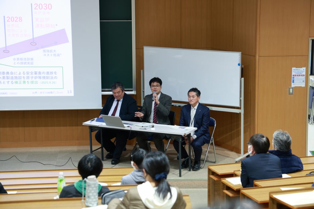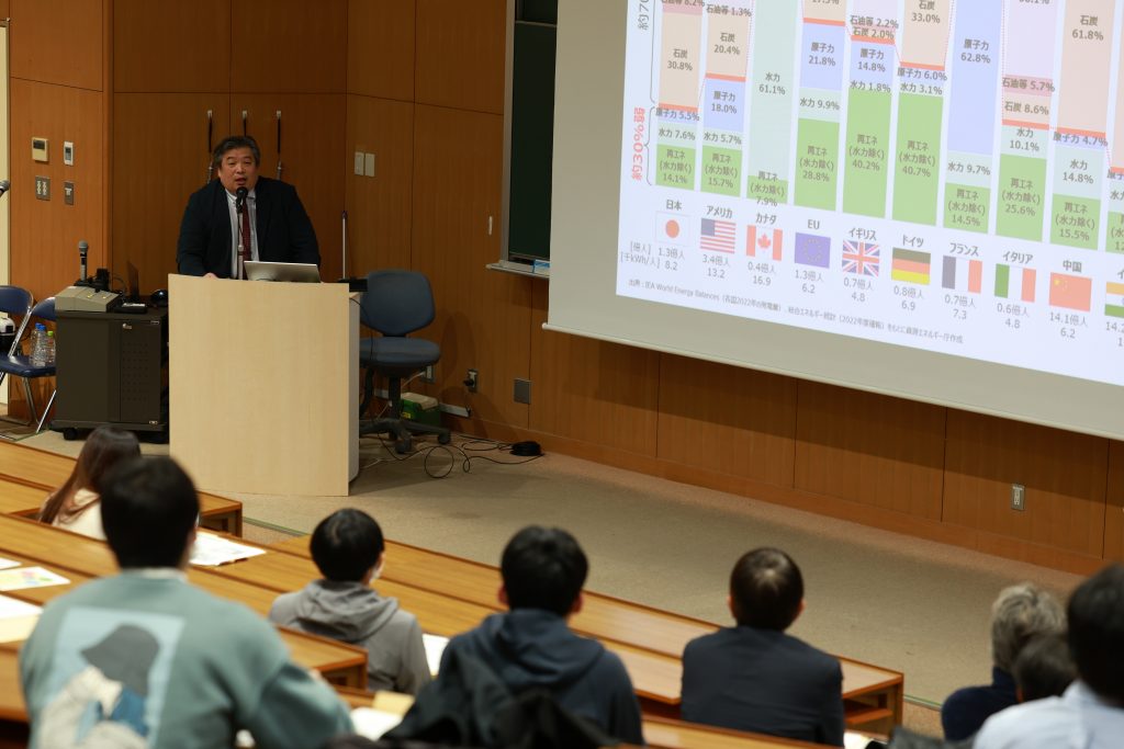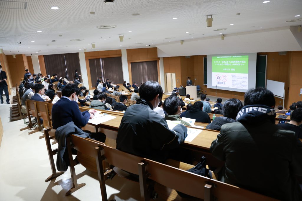 2025年12月5日に日立キャンパスJX金属ホールで「エネルギー政策と原子力技術開発の現状~エネルギー問題から人材育成まで~」と題し、茨城大学原子科学研究教育センターと日本原子力発電株式会社主催で日本原子力文化財団協力のセミナーが実施されました。経済産業省エネルギー・地域政策統括調整官の吉村一元氏と文部科学省研究開発局原子力課長の有林浩二氏のご講演を交え、日本のエネルギー問題について考える有意義な時間となりました。水戸キャンパスからも運行した送迎バスでの参加者を含め、総勢約100名の学生や教職員が参加しました。また午後の就職セミナーでの企業紹介も盛況でした。